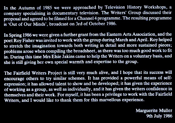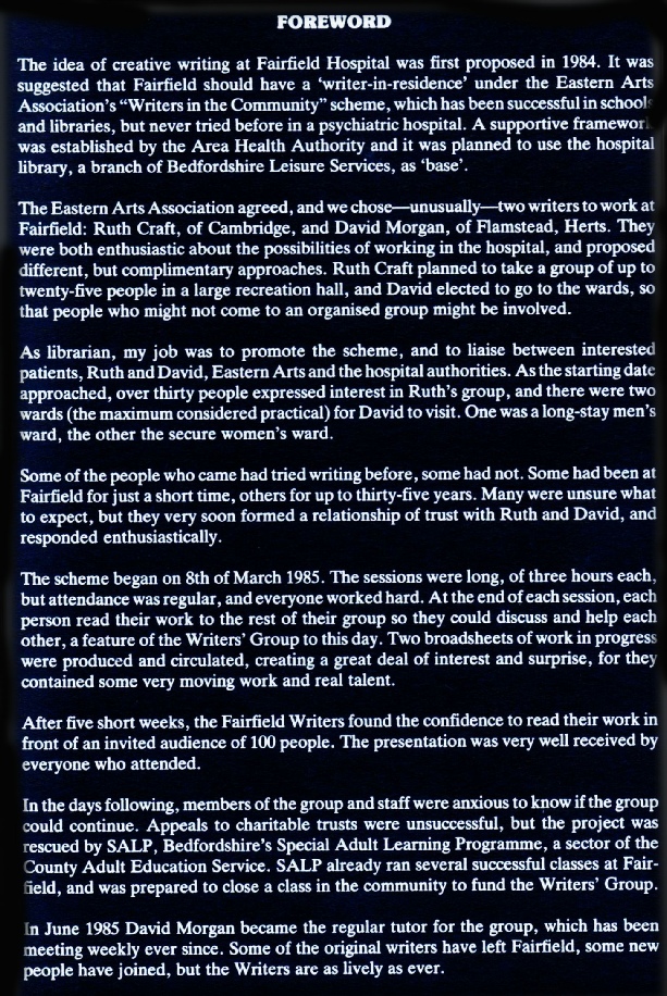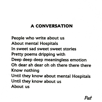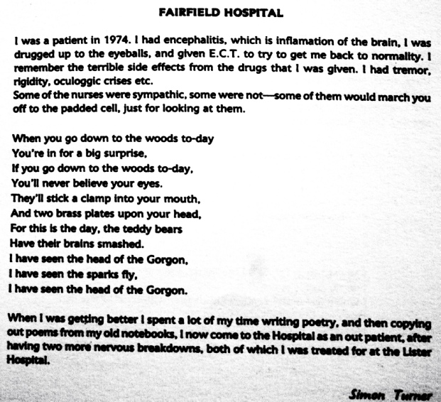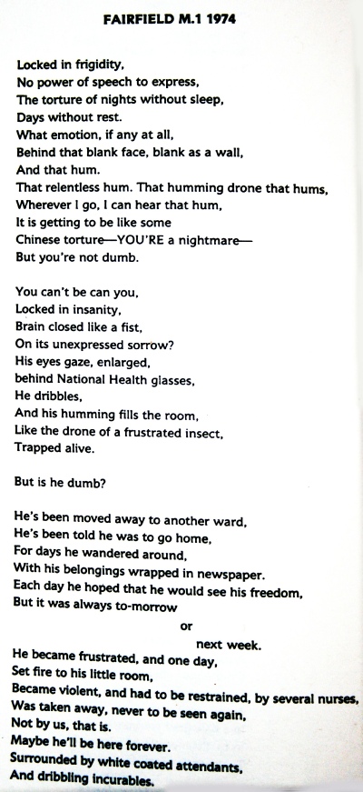 Creative writing gave patients at Fairfield Hospital in the 1980’s a chance to put their thoughts down in the form of poetry. Some poems highlight the sad side of being in a large mental health institution and others show a positive side, each writer telling their own story in poetry form. This was later to be a Channel 4 TV special titled Out Of Minds and broadcast on the 3rd October 1986.